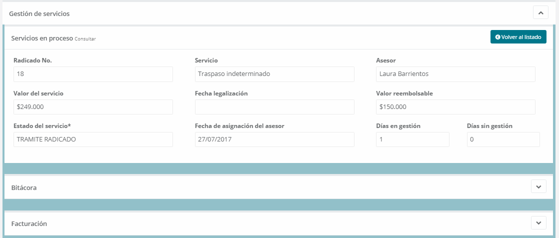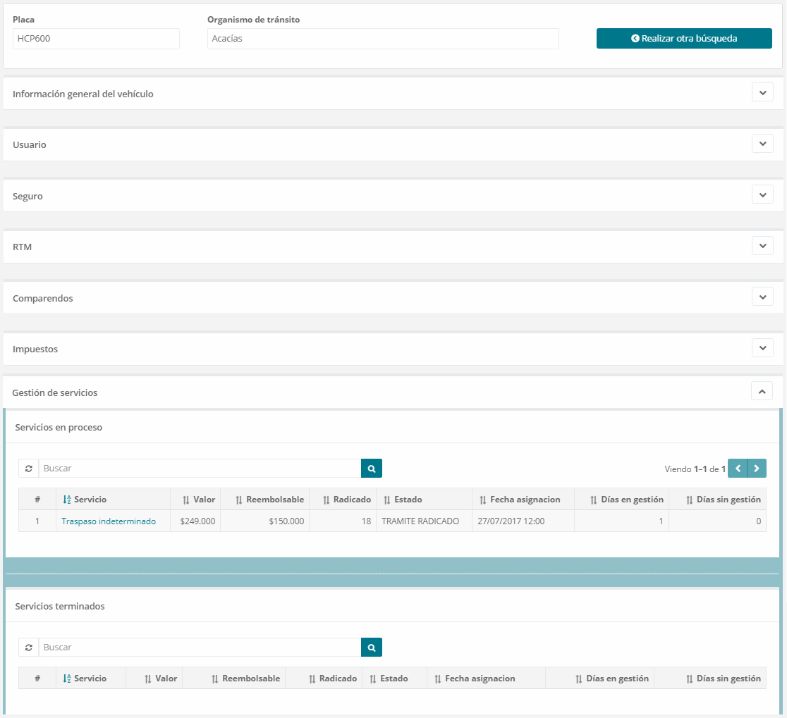 El usuaro con perfil Administrador del sistema, Asesor o coordinador, deberá ingresar a la opción Vehículos, que se encuentran en el menú principal, luego al ingresar a un vehículo existente podrá ingresar a la sección Gestión de servicios y en la tabla de Servicios en proceso podrá crear un nuevo servicios a través de la opción . Para registrar