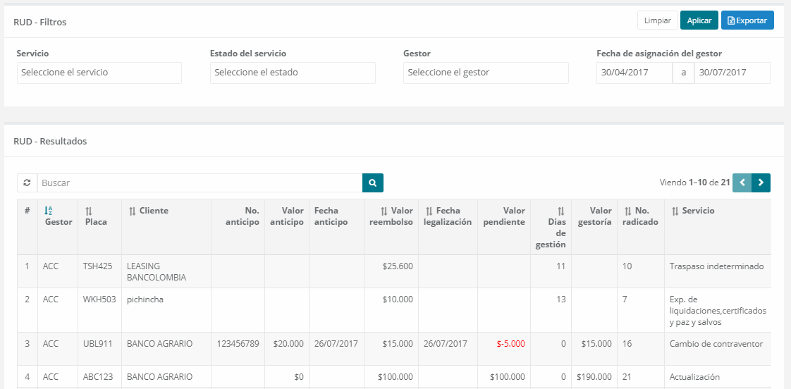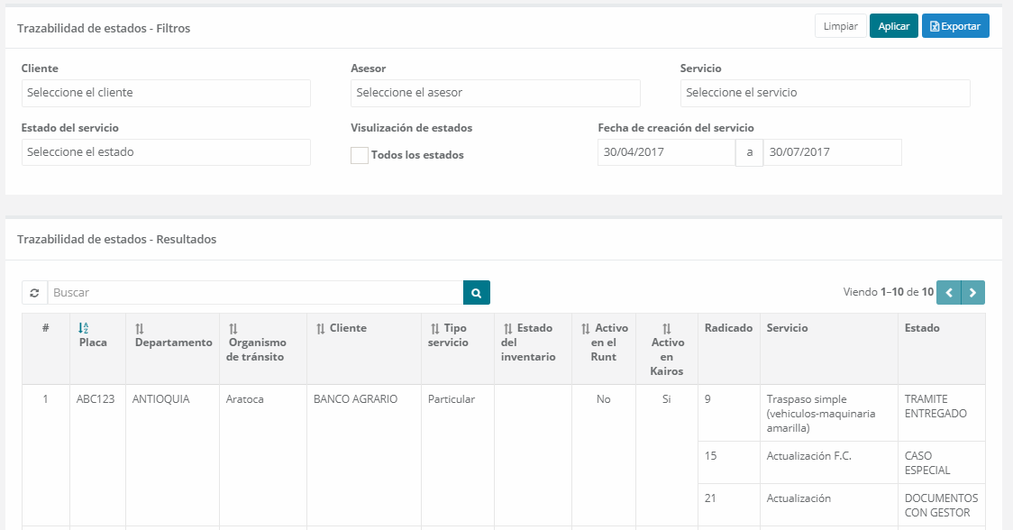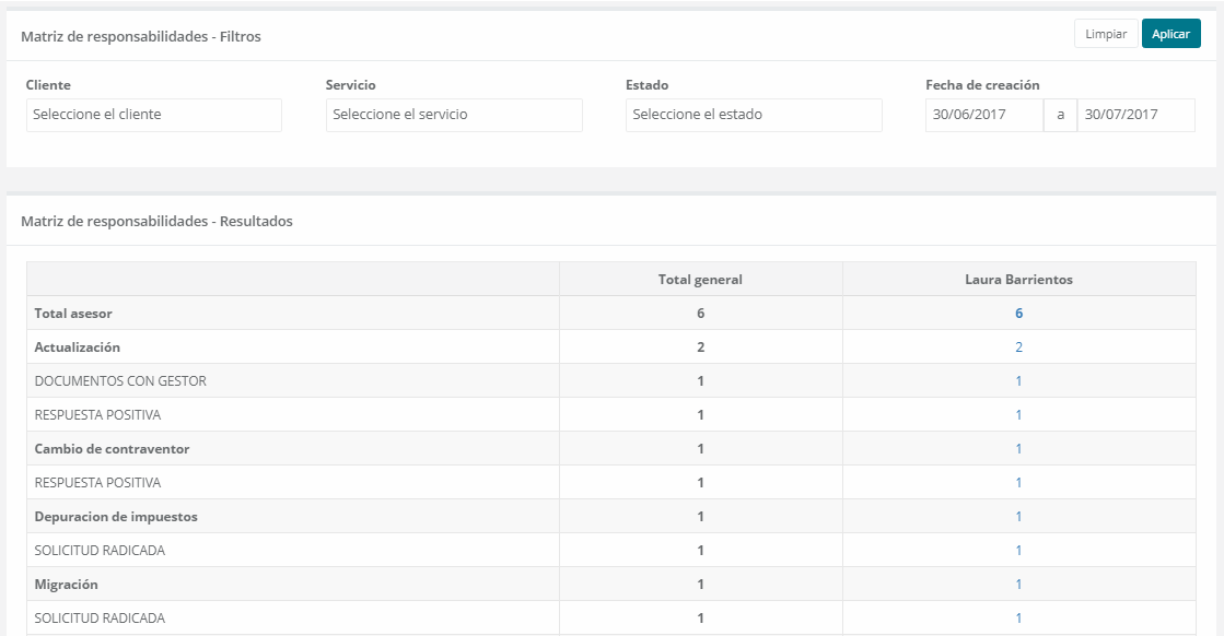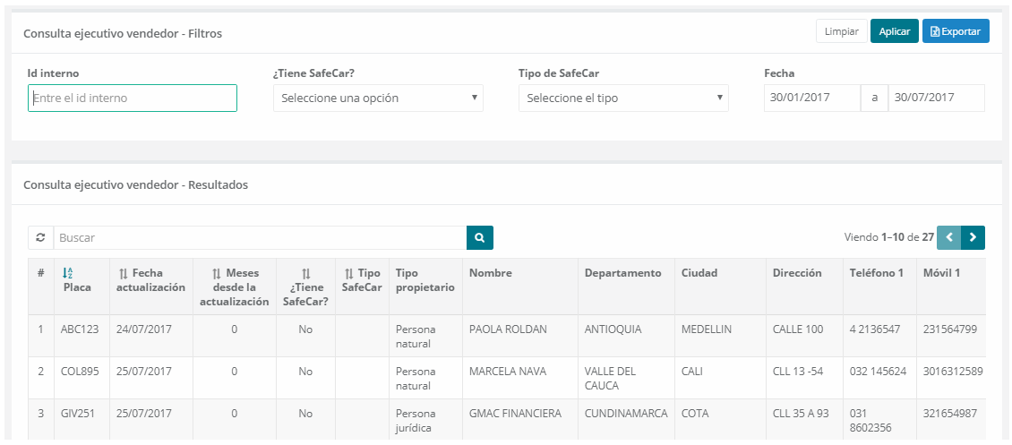 11. ¿Cómo puedo consultar los vehículos que tienen o no Safe Card? El usuario con perfil Ejecutivo vendedor o Administrador, deberá ingresar a la opción Ejecutivo vendedor del menú informes, el sistema presentará los filtros para consultar el reporte, en el caso del Ejecutivo vendedor deberá ingresar el Id interno para poder ejecutar el informe, además podrá exportar a Excel la información consulta, ta como se presenta en el siguiente ejemplo: El usuario con perfil Administrador o coordinador deberá ingresar a la opción Matriz de responsabilidades del menú informes, el sistema presentará los servicios existentes que están asignados a los asesores de Al Derecho, presentando para cada uno la cantidad asignada por cada tipo de servicio y estado, con opción de filtrar la información y de ver el detalle de los servicios: ![]()