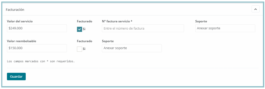 ![]() 10.¿Cómo puedo agregar la información de facturación de los servicios? El usuario con perfil Contabilidad deberá ingresar a la opción Vehículos del menú principal o a la opción de Facturación del menú de carga masiva. Al ingresar desde la opción de vehículos el usuario deberá buscar el vehículo para el que desea cargar la información de facturación y el sistema cargará la información del valor del servicio y del valor reembolsable, con la opción de completar la siguiente información: Al subir la información desde la